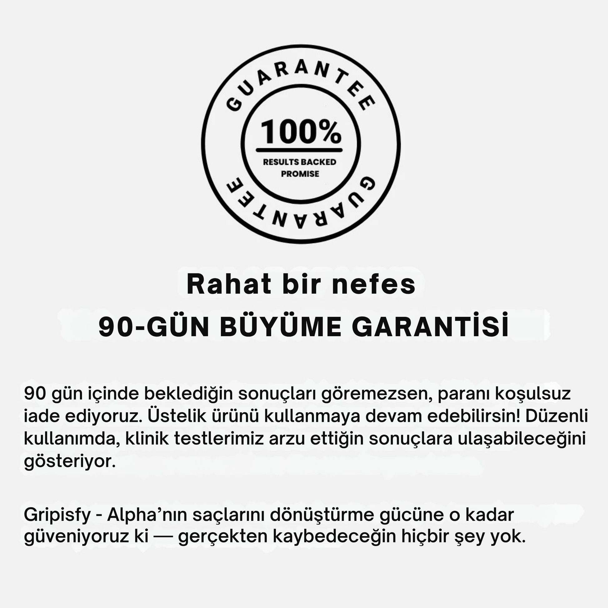 Her Alpha™ alımı, para iade garantisi ile desteklenir. Daha kalın ve dolgun saç görmezseniz, ürünü 90 gün içinde koşulsuz iade edebilirsiniz — hiçbir soru sorulmaz.