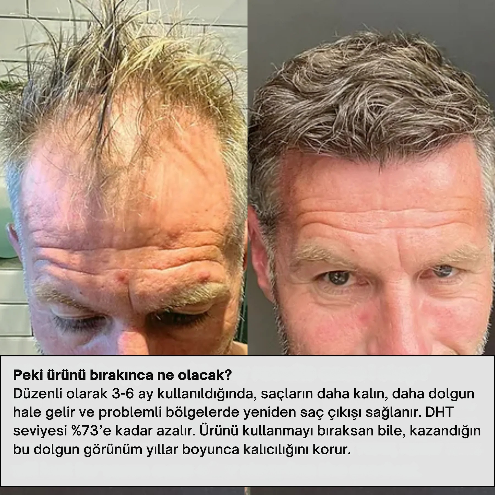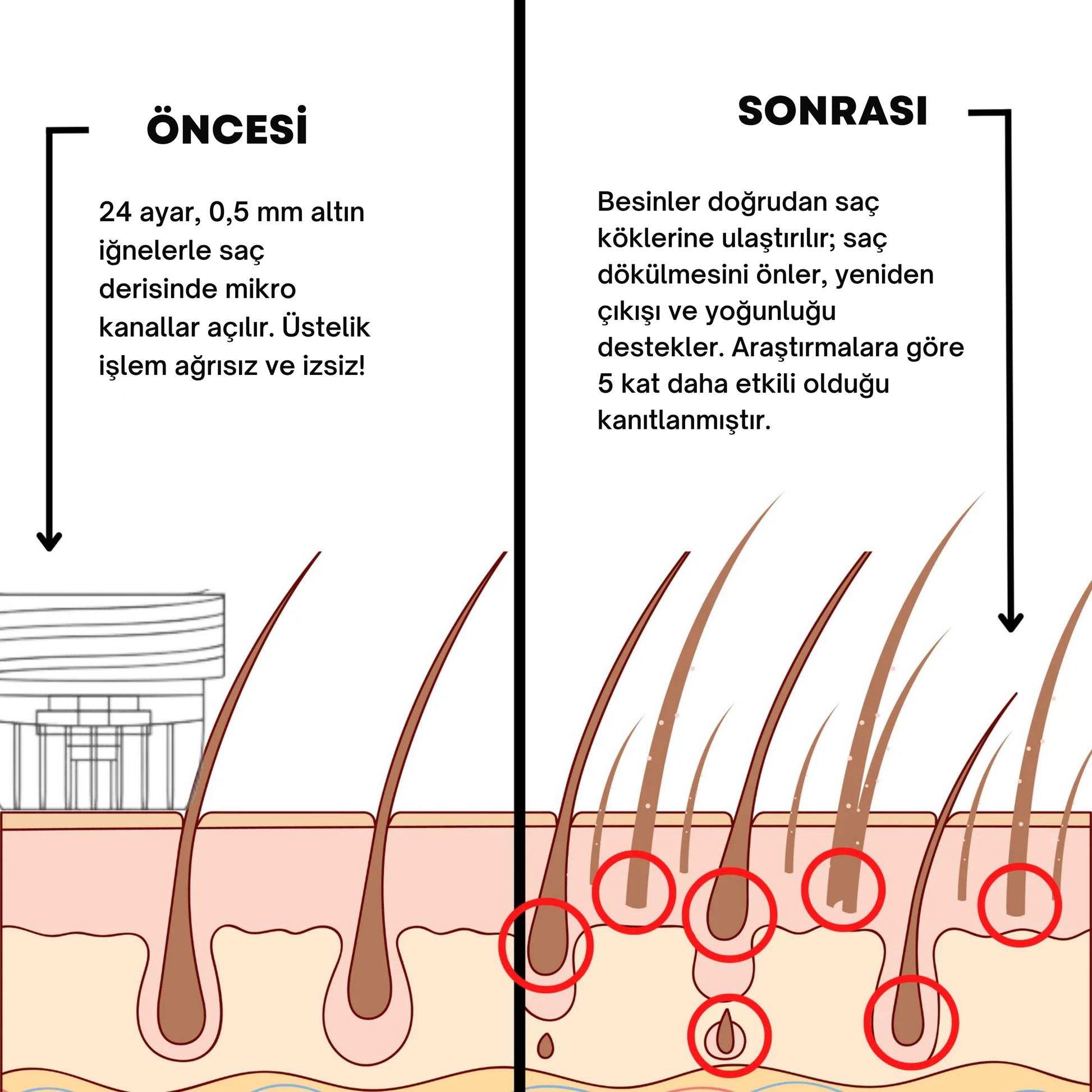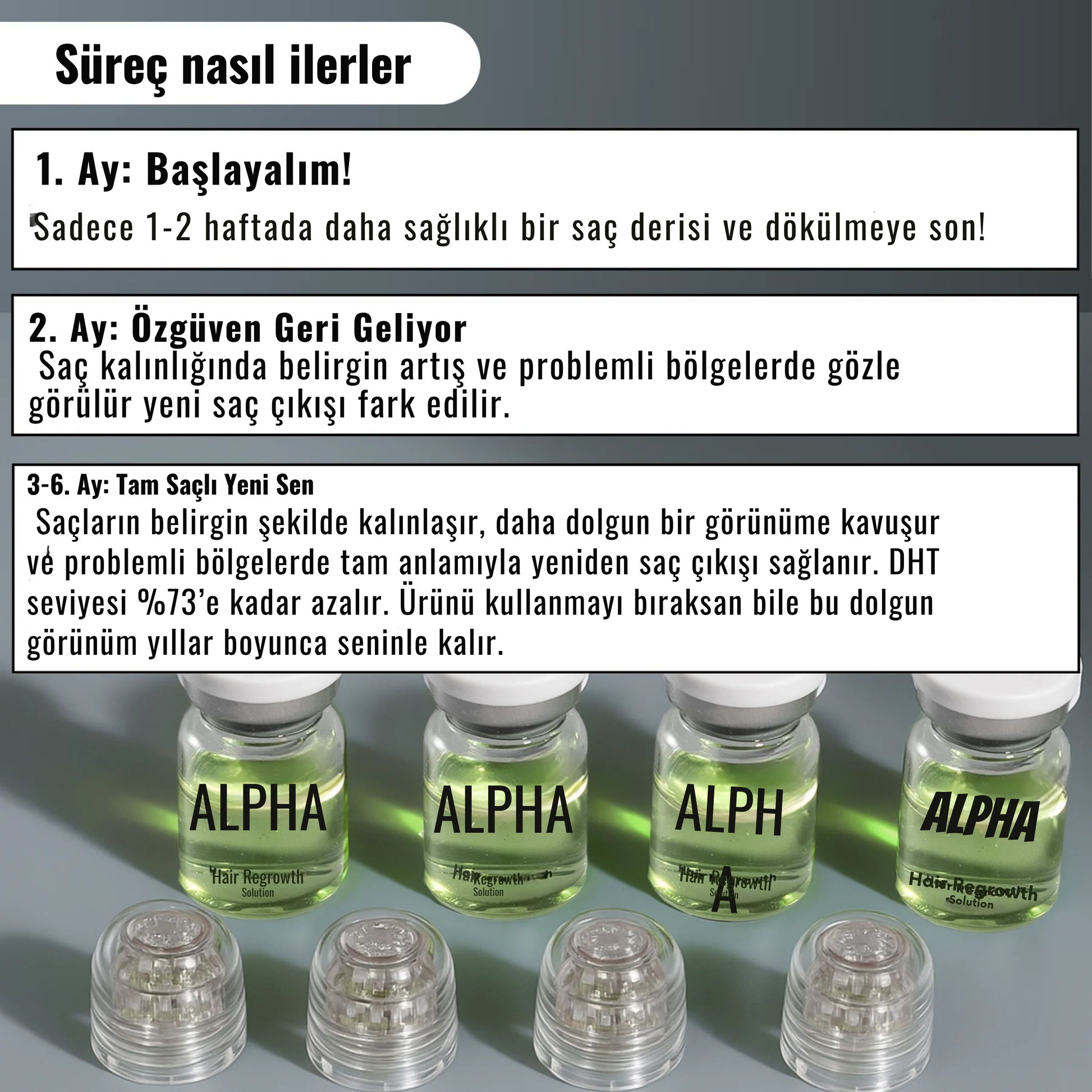 Alpha™, saç dökülmesinin temel nedeni olan fazla DHT ile savaşır. Mikro iğneler saç derisinde küçük kanallar açarak, aktif formülün derinlemesine nüfuz etmesini sağlar; böylece dökülme 1 haftada durur ve 4-8 hafta içinde hızlı saç yeniden çıkışı başlar.